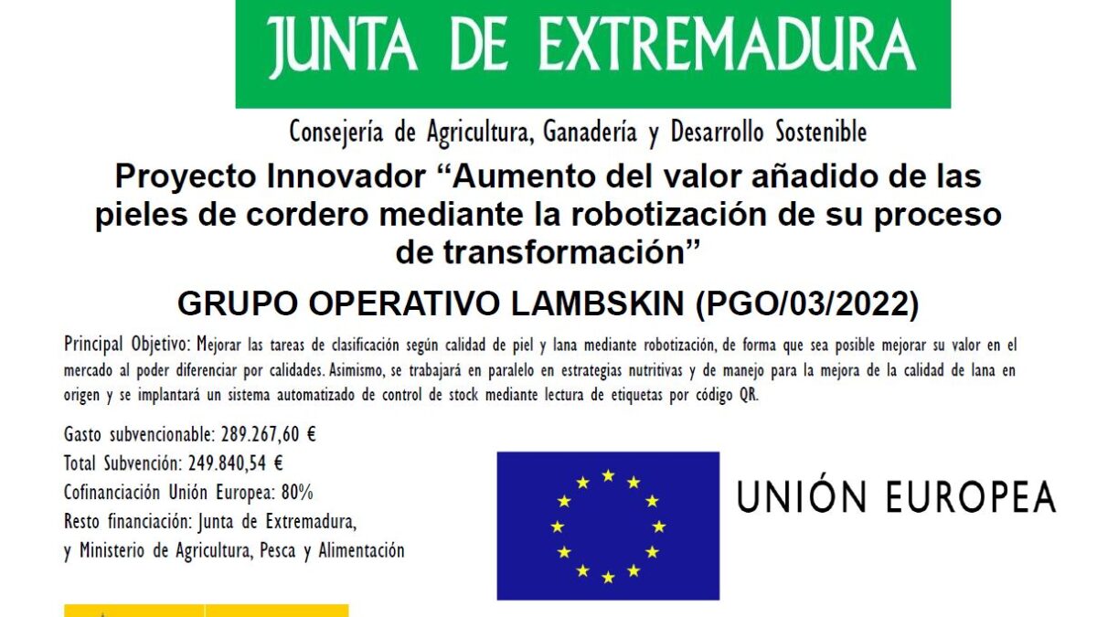 El Grupo Operativo Lambskin, es un proyecto con ayuda cofinanciada por el Fondo Europeo Agrícola de Desarrollo Rural (FEADER) en un 80 %, dentro del Programa de Desarrollo Rural (PDR) de Extremadura 2014-2022, en la medida 16 “Cooperación”, submedida 16.1 “Ayuda para la creación y el funcionamiento